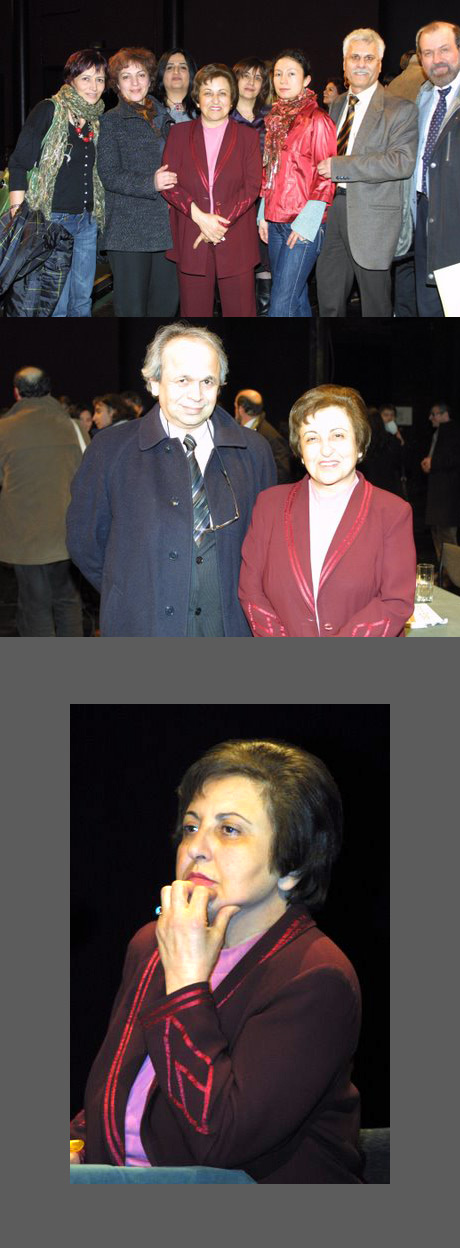 بود.این ادرس و محل سخنرانی ایشون و استادشون دکتر لاهیجی بود. خانم فرح کریمی هم دعوت داشتن اما پشت پرده مسائلی هست که همه از اون اطلاع ندارن و گه گاه انتظار دارن که خانم عبادی باید حرف خودش را نه و حرف دل انها را بزنه. البته بگذریم از اینکه ایشون جایزه نوبل را بهمین دلیل گرفتن چون از حقوق مردم دفاع میکرد. ایشون در این ماههای اخیر زیر شدیدترین حملات و فشارها بخودشون و دیگر ازادیخواهان تصمیم گرفتن که بیان بیرون و گذارش این وحشیگری بسیج و مافیای قدرت را بجهان ازاد بدن. ابتدا قرار بر یک گذارش ساده نبود. و اقدام عملی هم که الان جائز نیست از اون حرفی زده بشه در برنامه بود.و چون ایشون در اخرین لحظات پشیمون شدن برنامه را تغییر دادن.ولی با حمایت بین المللی و داخلی که دارن هر وقت ایشون در خارج از کشور فراخوانی بدن برای تشکیل دولت موقت از طرف سازمان ملل مورد تایید خواهد بود. مشروعیت حکومت از سران نظام اسلامی با جنایتهایی که کردن گرفته شده. و این بستگی به بلوغ فکری اپوزیسیون داره که ایشون کی اونکار را یعنی فراخوان برای تشکیل حکومت جانشین را بدن. در عکس اول هم در سمت راست ایشون اساتید ایرانی در دانشگاه بروکسل، و سمت چپ مترجم ایشون در کاپشن قرمز و رئیس جمعییت یوروپرس و مدیر برنامه هستن. پشت سر ایشون هم تعدادی از ایرانیها و ...سخنرانی ایشون در اتحادیه اروپا در 17 مارت خواهد بود. |