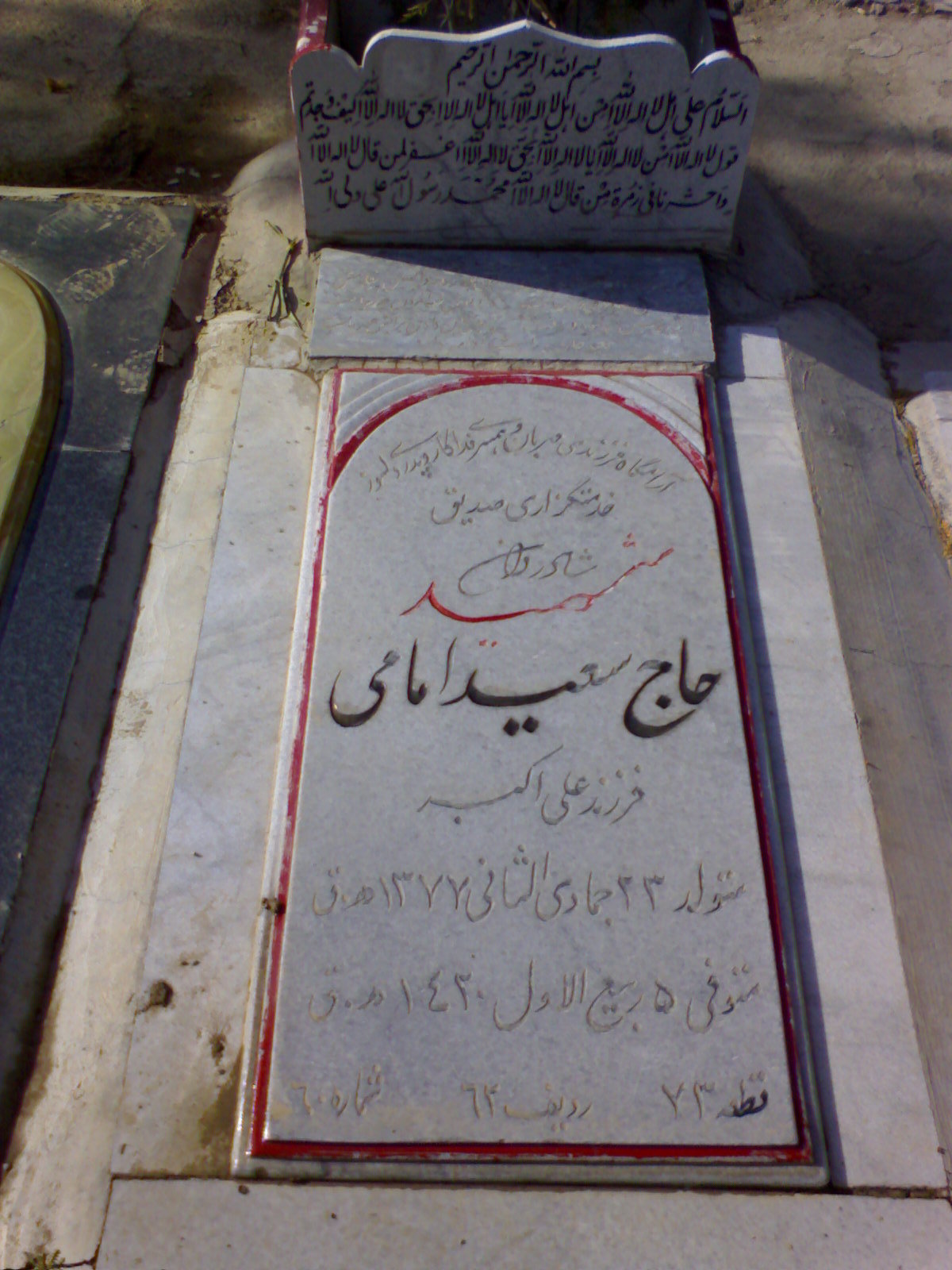 سنگ قبر  سعید امامی , اون که فوت شد و یا به قولی خودکشیش دادند و رفت ولی بالای قبرش نوشته فرزندی مهربان و همسری فداکار و پدری دلسوز ولی کاش این ها فقط برای خانواده خودش نبود و برای مردم هم همین طور بود . هر چند که با بلایی که به سر همسرش آوردند ثابت شد که نتونست برای زنش همسری فداکار باشه و راه رو اشتباه رفت .