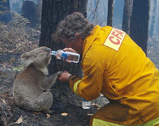 نه دوست عزیز؛ این عکس به این علت خیلی معروف شد و تقریبا یک ماه پیش رو صفحه اول خیلی از روزنامه های دنیا چاپ شد که نشونگر روح لطیف و طبیعت دوست مردم استرالیا بود. این عکس در آتش سوزی عظیم ایالت ویکتوریا گرفته شده که تعداد زیادی انسان از بین رفتند و هزاران هکتار جنگل و به همون نسبت حیات وحش نابود شد. در همین بین علاوه بر نجات انسانها نجات حیوانات هم در دستورکار بود که این عکس یکی از شواهدشه. این آتشبان در کمال مهربانی داره به یک کوالا که از تشنگی در حال مرگ بوده آب میده. خیــــــــلی صحنه زیبایی بود. حرف مهرگان هم درسته. کوالاها در مواقع معمولی آب نمیخورند و آب برگ اکالیپتوس براشون کفایت میکنه ولی وقتی هوا خیلی گرم میشه اونها رو میشه در جستجوی آب کنار شیر آبهای خونگی و استخرها و حوض ها پیدا کرد. در این آتش سوزی؛ علاوه بر گرمای وحشتناک هوا تمام برگهای اکالیپتوس هم سوخته بودند که نشون میداد وضعیت این حیوونهای بیگناه تا چه حد وخیم بوده.