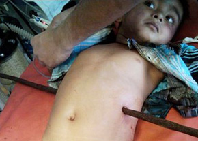 این پسربچه شش ساله که «ماهول کومار» نام دارد، روز گذشته توسط خانوادهاش به بیمارستانی در شهر «رانچی» واقع در «جارخاند» در هند منتقل شد و پزشکان طی یک عمل جراحی یک میله دو متری را که از پشت، کمر و پهلوهایش بیرون زده شده بود، بیرون آوردند.