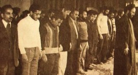 نماز جماعت به امامت آقای خاتمی که پشت سرش هم آقای رجایی رئیس جمهور وقت اون زمان ایستاده