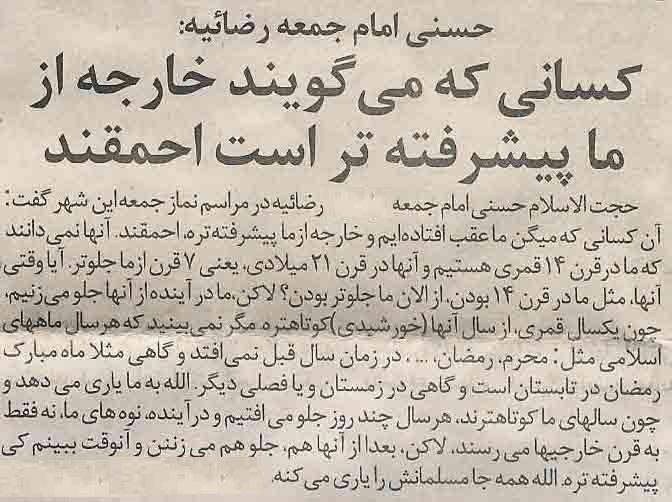 راستی روزنامه صحبتای ملا حسنی چاخان بود دیگه.من از خریت این خیلی شنیدم اما روزنامه چیه که دیگه اینقدر تعطیل نبوده که چاپش کنه. |