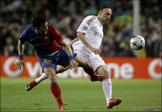 جدال فرانک ربیری (راست) با دانیل آلوس بر سر توپ. با شکست سنگینی که مونیخی ها پذیرفتند، بخت بالایی برای صعود ندارند.