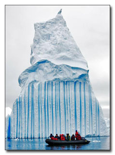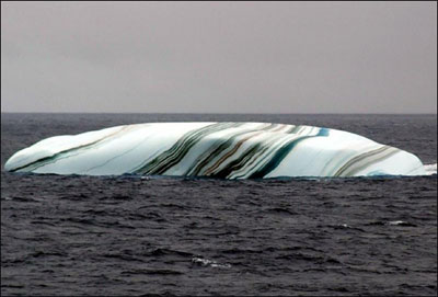 بله، این یک توده یخ واقعیه و نه، رنگ نشده. این توده ها در سواحل آفریقای جنوبی مشاهده شدن. به نظر میرسه این راه راه ها بخاطر لایه های رسوبی یا موجودات ریز مرده گیرافتاده در لایه های یخی در طول زمان باشه.