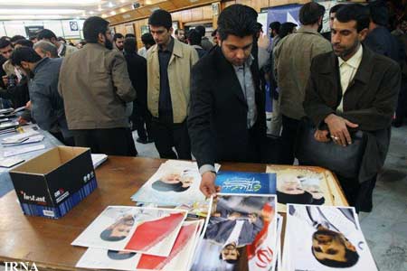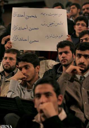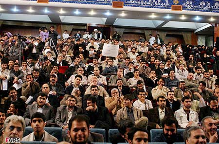 **حاضران برگه هایی را مبنی بر اعلام آمادگی برای همکاری با ستاد حرکت خودجوش دانشجویی و جوانان حامی دکتر احمدی نژاد پر می کردند و به مسوولان جلسه تحویل می دادند.