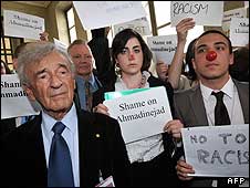 | الی ویزل (سمت چپ) بازمانده هولوکاست و برنده جایزه نوبل از جمله معترضان به آقای احمدی نژاد بود |