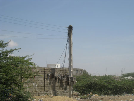 وضعیت عجیب و خطرناک برقرسانی در شهری که عموما هوای مرطوب و بارانی دارد، سیمها از روی زمین منتقل شدهاند و کنتورها که روی دیوار نصب شدهاند