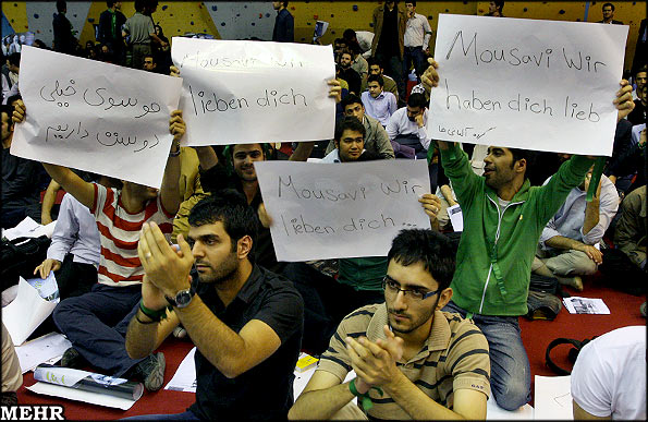 دانشجویان در این لحظه با تشویق میرحسین موسوی، فریاد «موسوی موسوی حمایتت میکنیم» سر دادند.