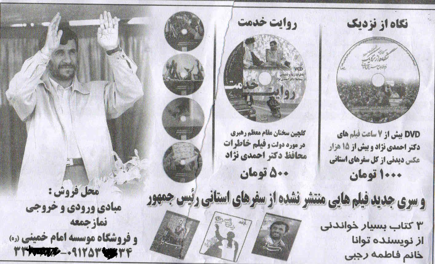 ما همین جوری حوصله احمدی نژاد رو نداریم حالابشینیم دی وی دی هاشو هم نگاه کنیم.مفتشون هم گرونه 1000 تومن با ارزش بدیم که بیاریم بالا؟؟؟ |