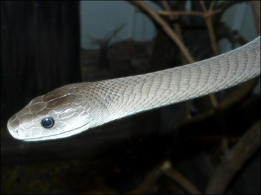 تصویر یک مار مامبا سیاه که برخلاف نامش رنگی نقره ای دارد. این مار علی رغم جثه کوچک و باریکش دارای یکی از مرگبارترین زهر ها در دنیای مارها است و در نیش زدن به هر موجودی لحظه ای تردید نمی کند