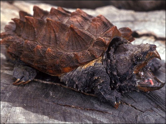 تصویر یک گونه لاک پشت به نام (Alligator Snapping Turtle ) که یادگاری از دوره دایناسورها بوده و فقط در آب های رودخانه های جنوب ایالات متحده زندگی می کند. این لاک پشت گوشتخوار از خوردن هیچ نوع گوشتی رویگردان نیست و حتی قادر به کشتن تمساح های کوچک است