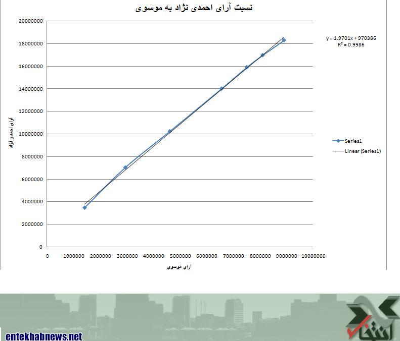این نمودار نشان می دهد که نسبت آرای احمدی نژاد به مهندس موسوی از یک نسبت خطی تبعییت می کند.