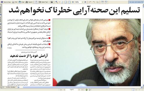 بدین ترتیب رئیسجمهور منتخب ملت ایران کسی جز میرحسین موسوی نیست و همانطور که آقای موسوی نیز در مصاحبه مطبوعاتی جمعه شب تاکید کردند، نتیجه متفاوتی که از سوی وزارت کشور دولت احمدینژاد اعلام شده، همانند آمارهای رئیس دولت در ایام انتخابات، دروغین و تقلبی است. |