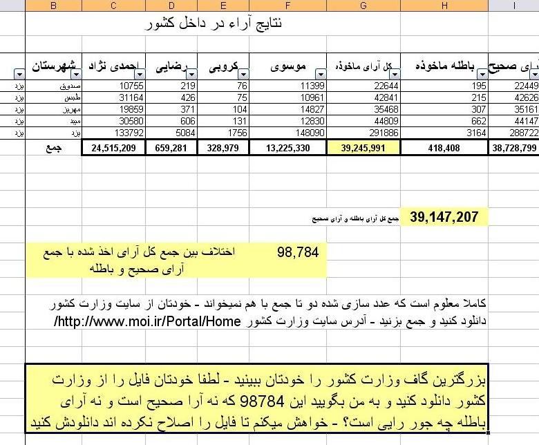 دوستان توجه داشته باشید که برای مدتی این فایل رو نمی شد دانلود کرد و بعد که دوباره می شد دانلود کرد عدد موردنظر رو اصلاح کرده بودند. خاک بر سر دولتی که عواملش جمع و تفریق بلد نیستند. خدا به داد بقیه امور مملکت برسه. |