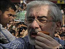 میر حسین موسوی در بین هزاران نفر از هوادارانش که به نتایج انتخابات ریاست جمهوری اعتراض دارند، در میدان امام خمینی تهران حاضر شد.