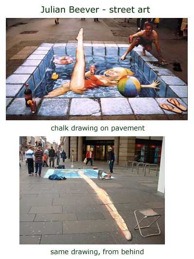 جولیان بیور متخصص نقاشی روی پیاده رو به سبک خاصی است که از زاویه خاصی نقاشی های او کاملاً سه بعدی و طبیعی به نظر می رسد در حالی که از زاویه دیگر ممکن است نتوان حتی موضوع آن را تشخیص داد.