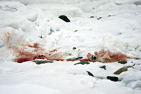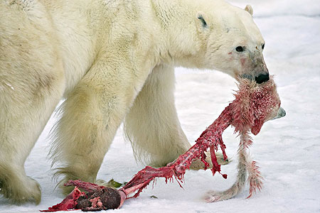 در این تصاویر به وضوح دیده می شود که یک خرس قطبی بزرگسال نر با دندانهای خود سر یک خرس قطبی کوچک را حمل می کند. این خرس نر کمی قبل خرس کوچک را کشته و گوشت آن را خورده بود.