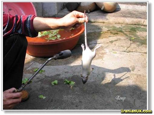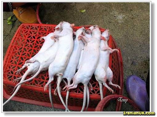 ااااااااااااه ااااااااااه / اتفاقی قبل از خوردن صبحونه اینا رو دیدم وگرنه همین جا روی کامپیوتر استفراغ میکردم (ببخشید دیگه! همش تقصیر کسی ست که این عکسها رو گذاشته ، مرسی!!! واقعا که...!!! سال نو میلادی مبارک!!!.. کادوی جالبی بود!!!❊❊❊❊❊) . بزرگمهر جان گرامی، اگر مردمی که گوشت گاو ، گوسفند و مرغ می خورند، تغذیه این حیوانات از گل و گیاه است و تحت نظر دامپروران کنترل میشوند و از این نظر گوشتشان قابل مصرف می باشد، هر چند.. ولی موش جونور یست که هر اشغالی رو می خوره حتا اجساد جانوران درنده و خطرناک را و در ضمن موش، ویروس امراض کشنده را به انسان منتقل می کنه و خوردنش جرات می خواد. این موشهای سفید روی عکسها بیشتر شبیه به موشهای ازمایشگاه هستند که امراض مختلف را روی اینها ازمایش می کنند. من شنیدم که بعضی از رستورانها در چین گوشت سگ ، گربه و میمون و مار به مشتری ها سرو می کنند ولی خوشبختانه تا بحال ندیدم که بهم ثابت بشه// شنیدن کی بود مانند دیدن...// |