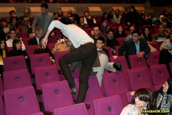 ارکستر همچنان در حال نواختن بود و سه نفر از ماموران امنیتی سالن روی صحنه در حال دویدن به دنبال او بودند. این دانشجو که از اعضای شبکه جوانان پیشروی ایران در هلند بود در نهایت توسط نیروهای امنیتی از سالن بیرون برده شد.