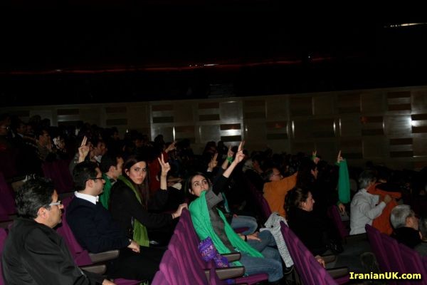 حرکات نیروهای امنیتی سالن به شدت فضای تالار را ملتهب کرد. در حین اجرا، شماری از بین جمعیت، پارچههای سبز و دستان خود را به نشان پیروی بالا بردند.