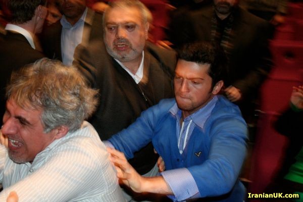 این حرکت با درگیریهای لفظی و سپس فیزیکی کارمندان سفارت جمهوری اسلامی در میان جمعیت با ایرانیان معترض همراه شد. در حالی که در مرکز سالن، تعدادی از نیروهای امنیتی سالن در حال جداکردن این افراد بودند، تعدادی از کارمندان سفارت ایران از روی صندلیها به سوی معترضان حمله بردند.