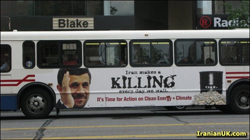 تصویر خندان آقای احمدی نژاد، یک بشکه نفت و اسکناس های دلار موضوع یک آگهی است که بر روی چند اتوبوس شهری نصب شده است.