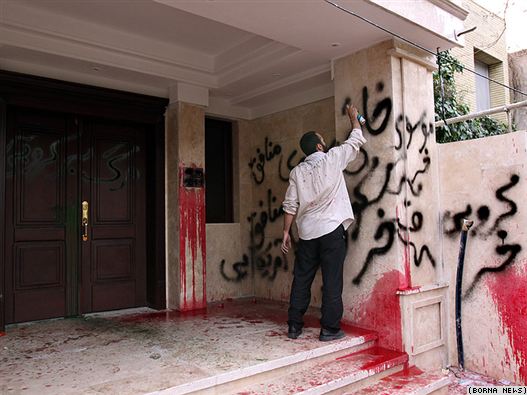 یکی از تجمع کنندگان در حال شعار نویسی بر ضد مهدی کروبی بر روی دیوار خانه وی.