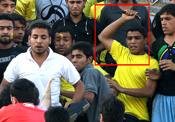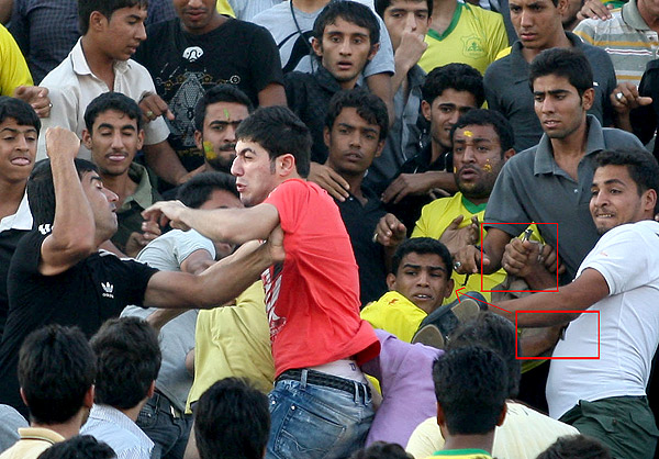 این تصاویر و همچنین عکسهای قبلی گویای این است که درگیری رخ داده مربوط به تماشاگران آبادانی در ورزشگاه تختی است. در چند عکس چاقو مشخص نیست و تصاویر، درگیری را نشان میدهند که در آنها چاقو در پشت فردی که مقابل دوربین ایستاده پنهان شده اما مربوط به همان صحنههای درگیری است.