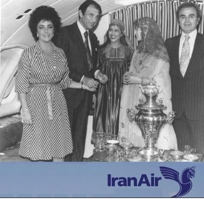 الیزابت تیلور هنرپیشه برجسته در اولین پروازمستقیم ایران ایر مابین ایران و آمریکا. ایستاده در کنار خانم تیلور اردشیر زاهدی سفیر شاهنشاهی ایران در واشنگتن , دو میهماندار ایران ایر در لباس های سنتی ایران و منوچهر گودرزی سرکنسول ایران در نیویورک |