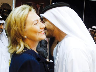 روبوسی هیلاری کلاینتون با شیخ عبدالله بن زاید وزیر امور خارجه امارات در سفر دوره ای در خاورمیانه