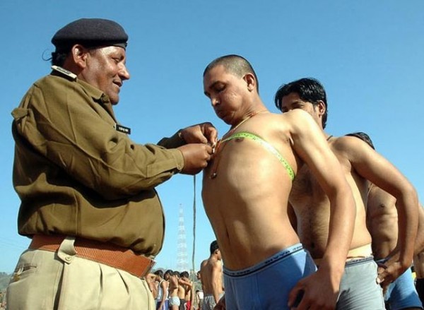 متقاضیان استخدام در پلیس هند در صف اندازه گیری اندام ( بوپال)