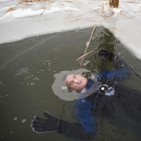 یک آتش نشان مجارستانی مشغول تمرین مقاومت زیر آب یخ بسته