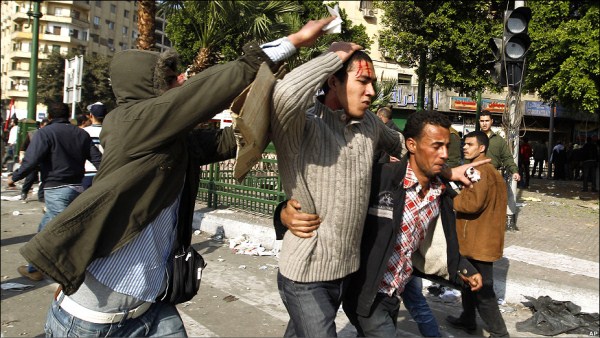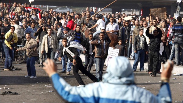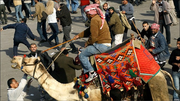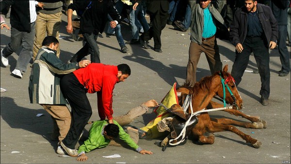 مخالفان دولت یکی از سواران هوادار مبارک را از اسب به زیر می‌کشند