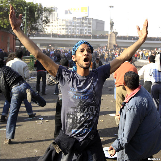 پاسخ جوانان مصری به دیکتاتور بزرگ جمهوری اسلامی. العربیه: بدنبال سخنان خامنه ای در نماز جمعه تهران که درآن تظاهرات کنونی مصر را "انقلاب اسلامی" خوانده بود گروهی از جوانان حاضر در میدان التحریر قاهره در تماسی با تلویزیون العربیه اعلام کردند که رهبر ایران فرهنگ مصریها را به خوبی نشناخته است. یکی از جوانان در گفتگو با العربیه گفت :" چیزی که به اصطلاح حمایت کنندگان از انقلاب کنونی جوانان مصر باید بدانند این است که تنها مصریها حق اظهار نظر در مورد مبارک را دارند. جوان دیگری ادامه داد : " ما چند روزی است که شعارهای " مردم سقوط مبارک را می خواهند " را سر می دهیم اما به هیچ وجه اجازه نمی دهیم که غیر مصری این شعار را سر دهند." . یک روزنامه نگار مصری نیز در گفتگو با تلویزیون العربیه درباره سخنان خامنه ای گفت: بین انقلاب اسلامی ایران و انقلاب فعلی مصر تفاوت های زیادی وجود دارد ، انقلاب ایران را در سال 1979 روحانیون و بازاریها رهبری کردند در حالیکه انقلاب مصر را جوانان نسل اینترنت رهبری می کنند. . . . .