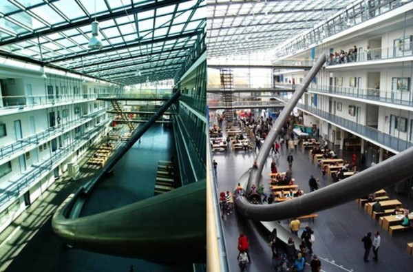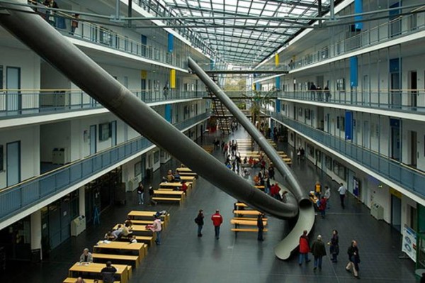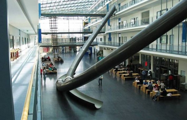 محاله ممکنه که آسانسور نداشته باشه . احتمالا تو اروپا یا امریکاست و محاله !. چون اون بقل پله هم هست ! احتمالا مدرسه است و واسه تفریح اینو گذاشتن . ولی سر خوردن تو لوله با این شیب هم باحاله و آدمو سرحال میکنه هم ترسناکه یکم ! اگر تو لوله تاریک سر خورده باشید میدونید چی میگم !