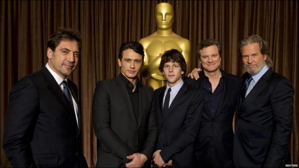 نامزدهای دریافت اسکار بهترین بازیگر مرد نقش اصلی. از راست: جف بریجز، کالین فرث، جس آیزنبرگ، جیمز فرانکو و خاویر باردم