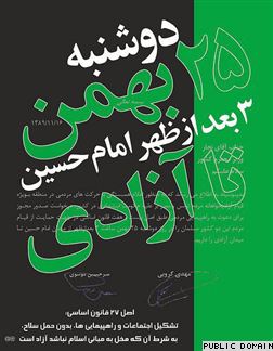 توجه.....! توجه.....! توجه.....! توجه.....! توجه.....! . وعده دیدار ساعت 3 بعدازظهر 25 بهمن 1389 در میادین اصلی و دانشگاهها، با شعار مرگ بر دیکتاتور - مرگ بر خامنه ای - مرگ بر احمدی نژاد - مرگ بر مشایی - مرگ بر جنتی - مرگ بر مصباح یزدی،... پیش بروید که خداوند یار و یاور شما خواهد بود. خداوند شما معترضان را حفظ کند، من هم شمار را حمایت میکنم. با اسلحه و چوب و چماق از خود دفاع کنید.