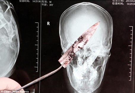 پزشکان پس از تصویربرداری رادیوگرافی در جمجمه این مرد یک تیغه ۱۰ سانتیمتری چاقو کشف کردند. پس از اعلام نتایج آزمایشات، این مرد چینی به یادآورد که دقیقاً چهار سال قبل با یک دزد درگیری منجر به ضرب و جرح داشته است.