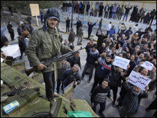بر اساس گزارش ها، نیروهای سرهنگ قذافی در پی حمله متقابل شورشیانی که به سلاح سبک مجهزند مجبور به ترک شهر شده و به حومه آن عقب نشینی کرده اند.