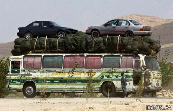 تازه !! همه این سوال را هم پرسیده اند که چطوری ماشین را گذاشته اند اون بالا. آخر ای هم شد سوال.؟ درعصر که بشر فضاراتسخیر کرده است گذاشتن یک ماشین بالای اتوبوس با جرثقیل که کاری نیست. دوتا fasting belt پارچه ای را رد میکنند از زیر سقف ماشین ودوتا بالشت میگذارند آن لبه ها که آسیب نبیند با جرثقیل میکشند بالا. امروزه هرماشین آلات که بخواهی در افغانستان موجود است.