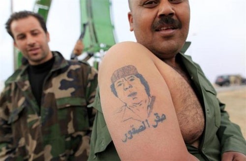 تصویر تاتو شدۀ قذافی بر بازوی یک نظامی