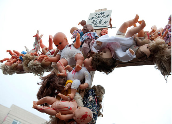 به میخ کشیدن عروسک ها بر روی یک صلیب در دروازه براندنبورگ برلین از سوی شهروندان آلمانی معترض به سوء استفاده جنسی برخی کشیشان کاتولیک از کودکان