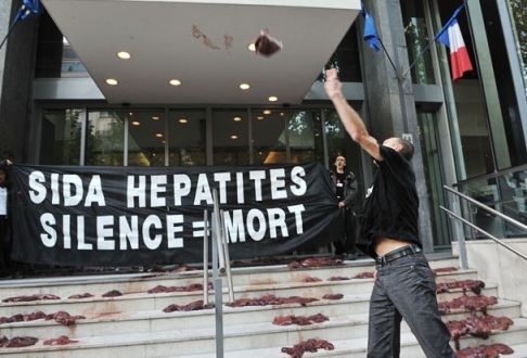 ریختن جگر حیوانات در مقابل در ورودی ساختمان وزارت بهداشت فرانسه در پاریس به نشانه اعتراض به سیاست های بهداشتی دولت فرانسه در کم توجهی به بیمارهای مبتلا به ایدز و هپاتیت
