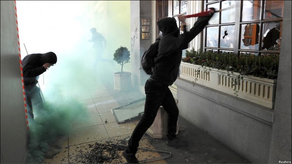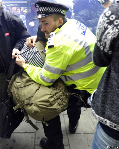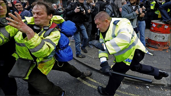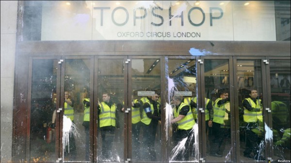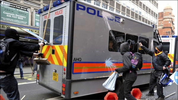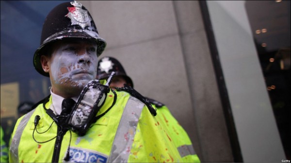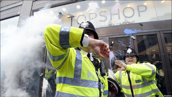 گروهی از معترضین بیچاره پلیس ها رو به چه روزی در آوردند. انواع رنگ ها به سمت پلیس پرت می کردند شیشه های فروشگاه "تاپ شاپ" رو آوردند پایین جالبتر اینکه رسانه ی بی بی سی می گفت گروهی از معترضان خشمگین به فروشگاه ها حمله کردند اما نشنیدم آنها را فتنه گر یا اغتشاش گر بخوانند درست برخلاف رسانه ی باصطلاح ملی ایران که معترضان مسالمت جو رو به زشت ترین وجه نامگذاری و نکوهش کنند! تضاد فرهنگی و آزادی بیان رو می بینید