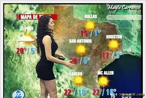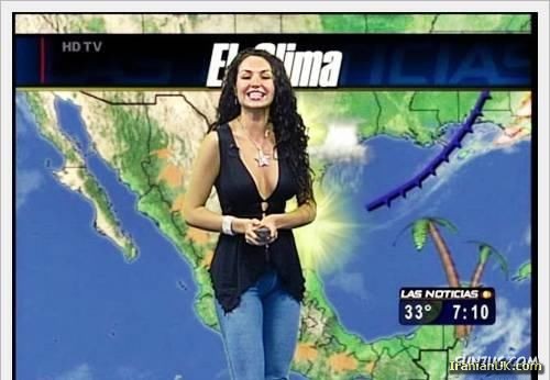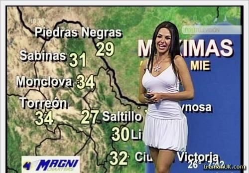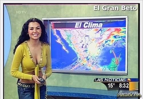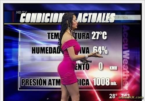 بابا این بیشتر شبیه جک هستش تا اخبار هواشناسی ..یاد یه برنامه طنز تو عید نوروز افتادم که کارشناس هواشناسی میومد در باره هر چیزی حرف میزد بجز وضعیت آب و هوا .مثلا به هر شهری که می رسید بجای وضعیت آب و هوای اونجا در باره آثار باستانی وسوغاتیهای اون شهر حرف میزد که همش هم اشتباه بود ...فکر کنم این خانوم هم بیشتر از وضعیت آب و هوا در مورد لوازم جدید آرایشی یا تاریخ شروع مسابقه ملکه زیبایی حرف میزنه ...حالا که اینطوریه منم نظرمو درباره اش میدم. به نظرم هیکلش بد نیست مثل اکثر زنهای آمریکای جنوبی ولی قیافه اش معمولیه مخصوصا که خیلی هم آرایش کرده ...