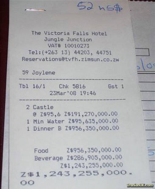 در ماه اوت دولت زیمبابوه با تنزل ارزش دلار، ده صفر را از مقابل اسکناس ها برداشت (از اینجا به بعد موضوع باید مورد توجه دولت با هوش ایران قرار گیرد که چندی پیش پیشنهاد تبدیل واحد پول از ریال به تومان را ارائه کردند)
