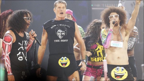 دیوید هسلهوف، بازیگر آمریکایی با اعضای باند LMFAO به اجرای آهنگ پرداخت.