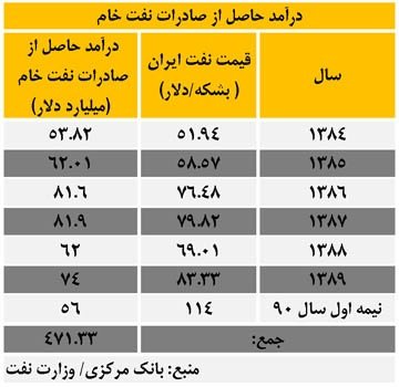 بر اساس آمارهای منتشر شده از سوی بانک مرکزی و وزارت نفت میزان درآمد صادرات نفت خام در دولت نهم معادل 279 میلیارد دلار بوده است و در دو سال ونیمی که از فعالیت دولت دهم می گذرد از همین محل معادل 192 میلیارد دلار درآمد کسب شده است و اگر پیش بینی نود میلیارد دلاری درآمد نفتی سال جاری (با احتساب متوسط 114 دلاری قیمت هر بشکه نفت طی نیمه اول امسال) محقق شود دولت نهم در سه سال فعالیت خود معادل 226 میلیارد دلار درآمد کسب می کند و در مقایسه با دولت نهم تنها از همین محل با رشد 14 درصدی درآمدها مواجه خواهد شد و در پایان سال 90 کل درآمد صادرات نفت خام دو دولت به 505 میلیارد دلار می رسد.