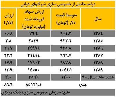 یکی دیگر از منابع درآمدی دولتهای نهم ودهم به واگذاری شرکتهای دولتی باز می گردد.کل درآمد حاصل از واگذاری شرکتهای دولتی (از سال 81 تا پایان آبان ماه سال 1390) معادل 87 هزارمیلیارد تومان است که بالغ 85 هزار میلیارد تومان آن از سال 84 تا پایان آبان ماه سال 90 محقق شده است. بر اساس نرخ دلار در سال های مورد اشاره می توان گفت دولت های نهم و دهم تنها از محل واگذاری شرکتهای دولتی معادل 86.6 میلیارد دلار درآمد حاصل شده است.