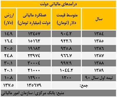 البته با توجه به رشد درآمدهای نفتی کشور، افزایش پیش آمده در بخش مالیاتی دور از ذهن نبوده ولی به هر شکل می توان گفت در سالهای 84 تا نیمه نخست سال 90 شاهد رشد درآمدهای مالیاتی و افزایش درصد تحقق پیش بینی شده در بودجه های سالانه هستیم؛ در این دوره کل مالیات وصول شده 135.6 هزار میلیارد تومان می رسد که معادل 137.5 میلیارد دلار می شود.
